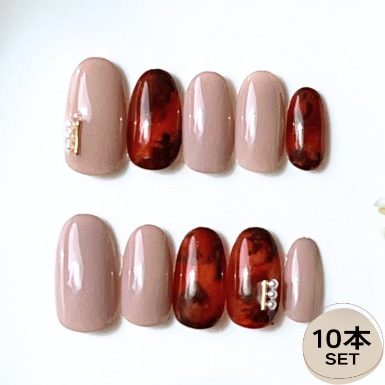 「Brownべっ甲飴 × ほうじ茶ラテセット」は、落ち着いたブラウンべっこうと上品なグレージュを合わせたネイルチップ。
