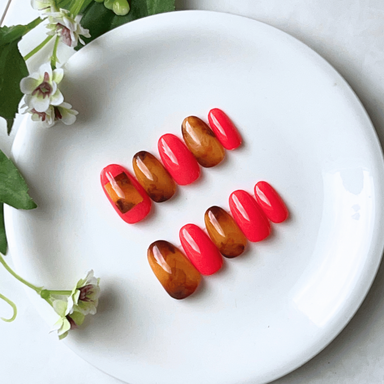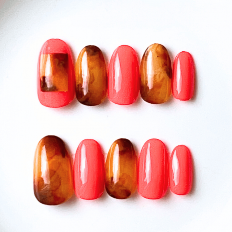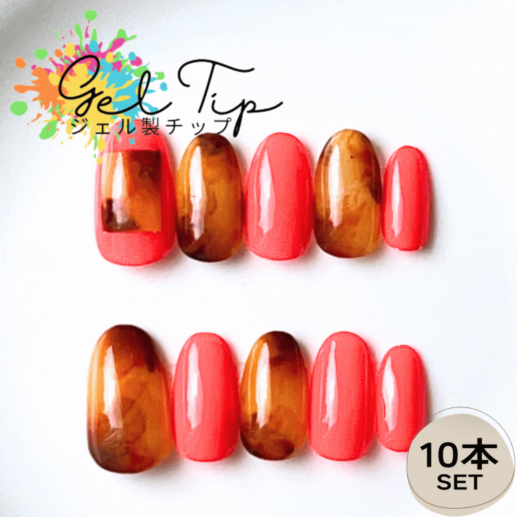 【ジェル製チップ】「Yellowべっこう × Pink Grapefruit」は、琥珀のようなイエローべっこうとフレッシュなピンクグレープフルーツカラーを組み合わせたジェルチップ。