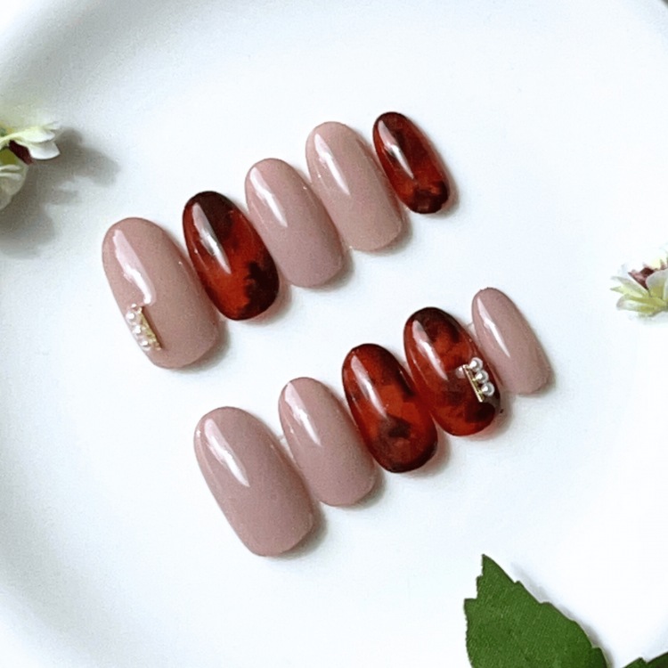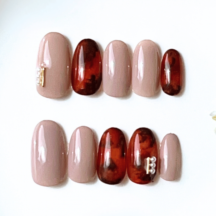 【ジェル製チップ】Brownべっ甲飴 × ほうじ茶ラテセット」は、ブラウンべっこうの艶やかさと、ほうじ茶ラテカラーの柔らかさが調和した大人のジェルチップ。