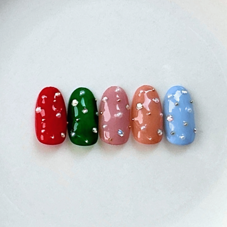 華やかさと上品さを兼ね備え、普段使いからお出かけまで幅広く楽しめます。 41種類のワンカラーとスキンカラーを合わせた全49色から選択可能。 形は6種類(ベリーショート/ショートオーバル/レギュラーオーバル/ロングオーバル/レギュラースクエア/アーモンド)をご用意しております。 お好きな色とお好きな形であなた好みのデザインをお選びください。 写真使用カラー:いちご/赤・玉露/緑・B2・Y2・天然水/パステルブルー